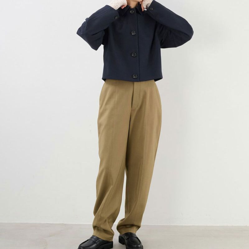 丈が少し長めのデザインなので、あえて裾をクッションさせて着るのもトレンドです。