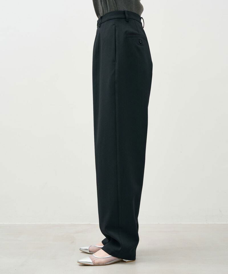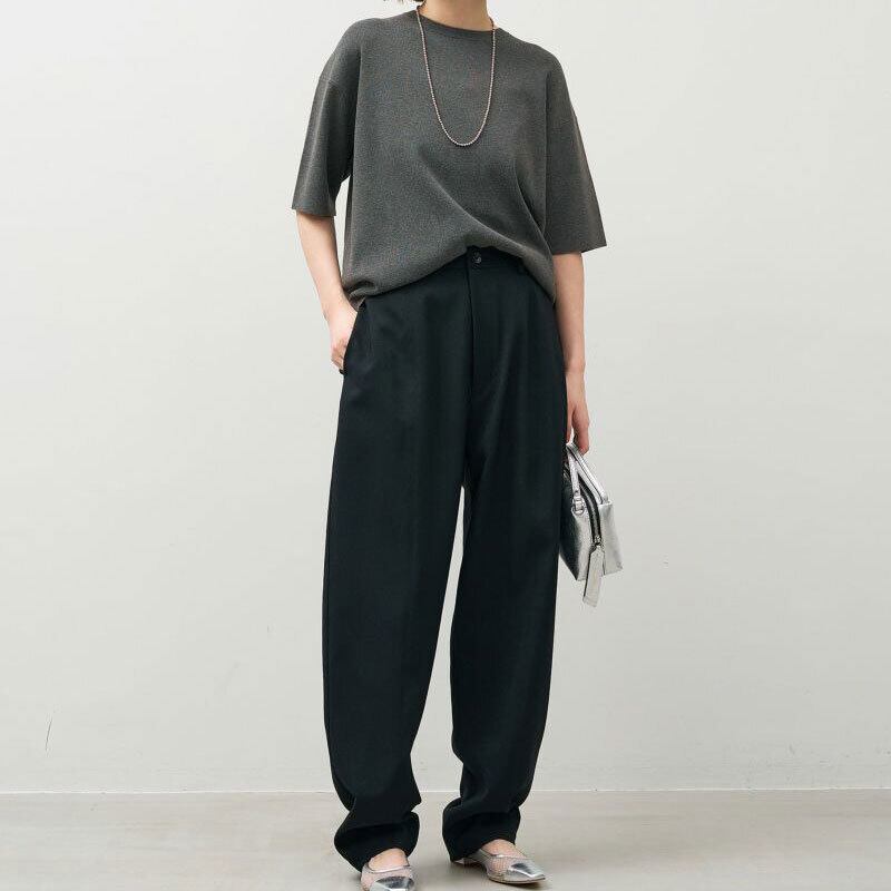 シンプルなトップスをインしてパンツのシルエットをポイントにしたスタイリングがおすすめ。