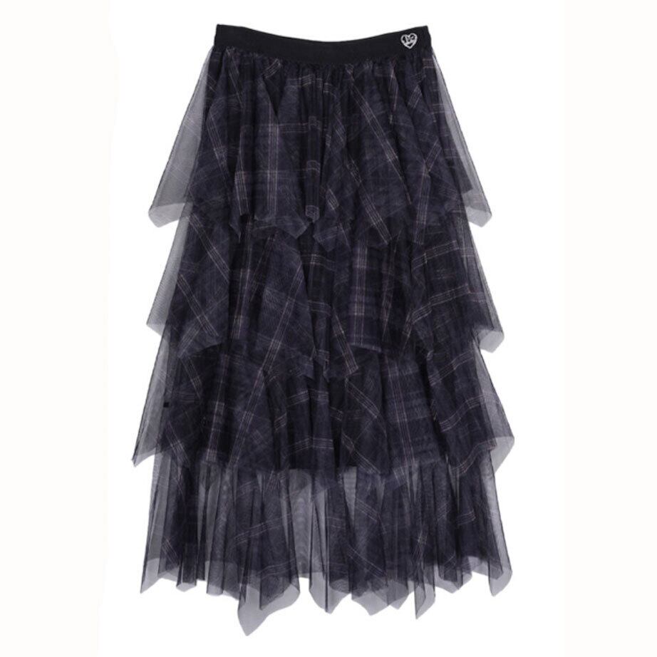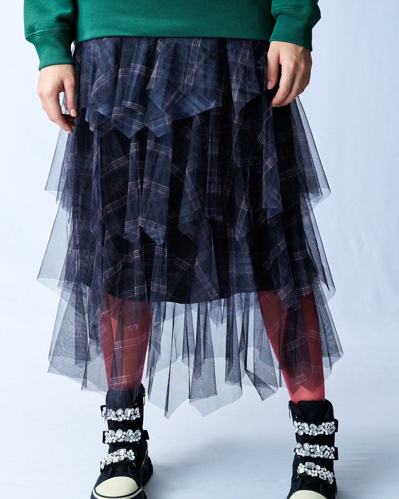軽やかなチュール素材を重ねた、COOLAのチェックティアードスカート。チェック柄が個性的でありながら、ふんわりとしたシルエットが女性らしさを引き立てます。カジュアルなスタイルはもちろん、きれいめコーディネートにも対応できる万能アイテムです。