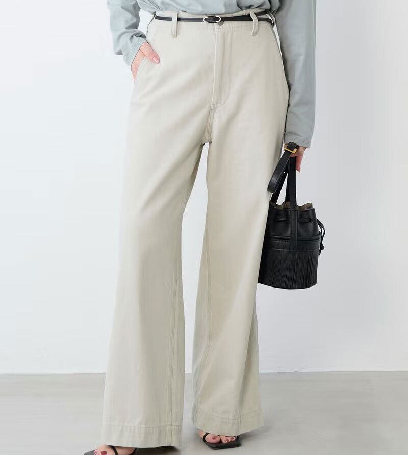 カジュアルな印象のチノ・デニムパンツをバギーパンツのシルエットに落とし込み、少しきれいめなエッセンスを加えました。