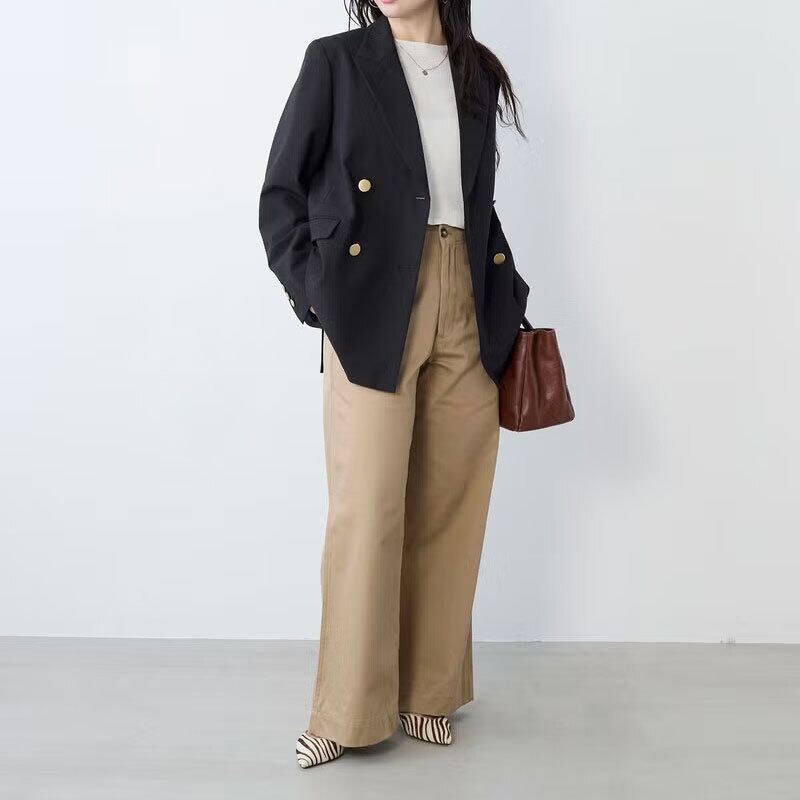 テーラードジャケットなどのきれいめアウターと合わせることで、上下のシルエットにメリハリのある、洗練された印象のコーディネートが完成します。