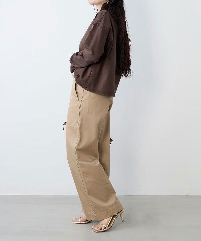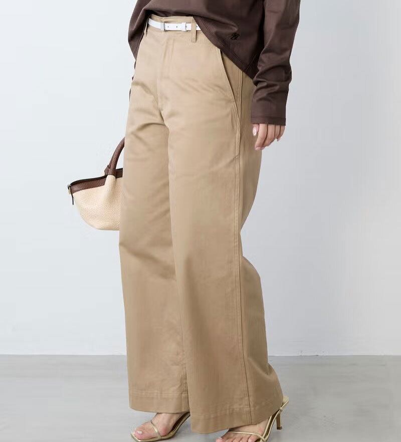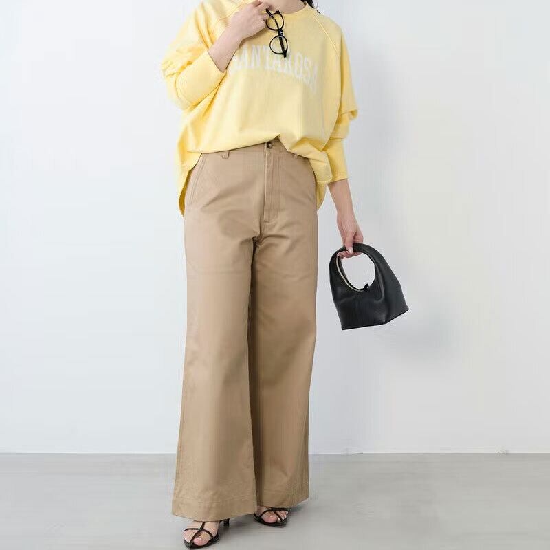 カジュアルな印象のチノ・デニムパンツをバギーパンツのシルエットに落とし込み、少しきれいめなエッセンスを加えました。