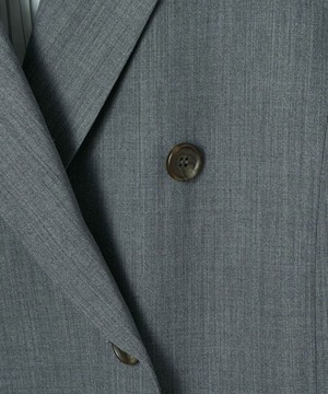 タテヨコ2/72TWを使用した素材です。ポリウレタンを入れず、打ち込みを込めた生機設計にすることで綾目が立ち、ドライタッチのシャキッとした仕上がりになってります。一方で風合いが固すぎず、仕立て映えする生地を使用しています。裏地はクラシックな雰囲気漂うストライプを使用し、脱いだ時も高揚感を感じるようにしています。また袖をめくった時にさり気なく裏地が見えるようにしています。カーキとグレーはスコッチ釦でクラシックなイメージに、ネイビーはゴールドボタンをあしらっています。