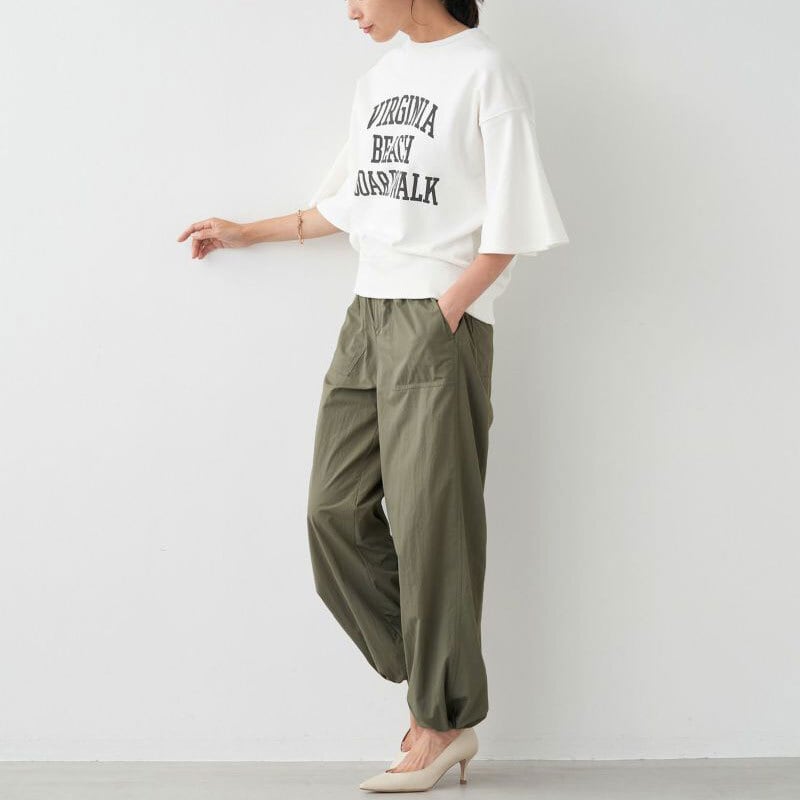 大好評なパラシュートパンツ。春らしいカラー展開でブラッシュアップ。リサイクルナイロンのタスラン糸を使用しいるため軽く仕上がっています。仕上げにタンブラーを入れているので柔らかい風合いの生地を使用したいます。パッチポケットと裾ドロストのディティールを入れつつ、カジュアルになりすぎないよう細部をキレイめにこなしています。スポーティな素材感なので、ヒールやパンプス、サンダルで女っぽさをプラスすると取り入れやすいです。